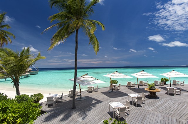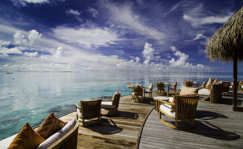 Yakitori, on the water’s edge is a great chill-out zone with comfy seating, and sun lounger service if you want it, a great range of drinks and friendly and inventive bar staff. Mirus (chilli in Dhivehi) Bar by the main pool is stylish both during the day and in the evening, and head barman Mendis makes a great Angelfish. Then there is The Shack bar, which has a location like no other.