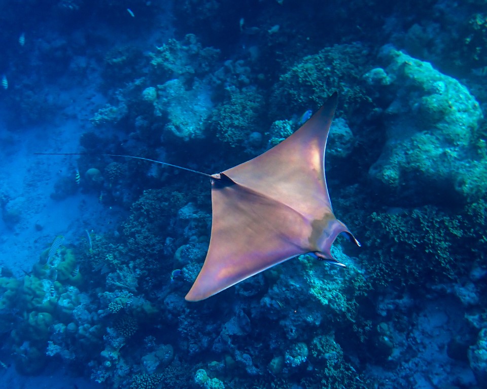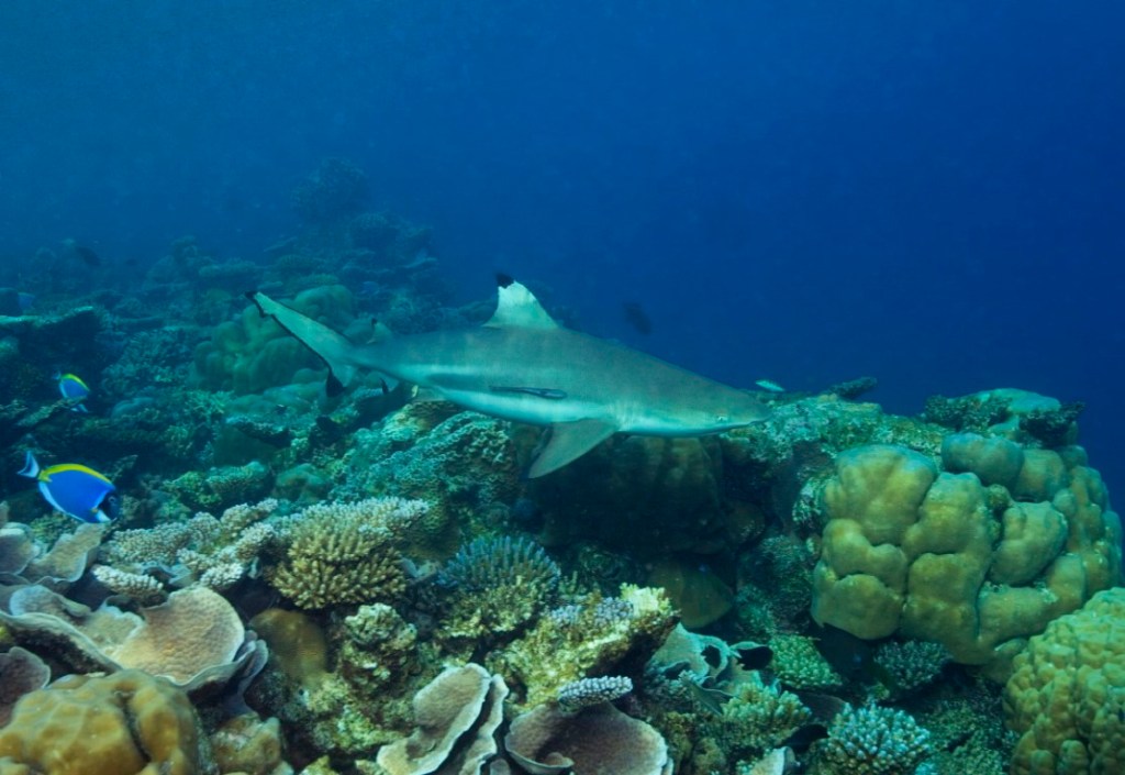 Easy access through channels from the lagoon to a vibrant house reef, one of the best that we have seen since the 2015-17 mass bleaching. Beautiful coral gardens to explore with plenty of varied marine life, including the most Regal Angelfish we’ve seen on a single reef. We also enjoyed a guided night snorkel with rays, nurse sharks and lion fish.