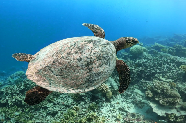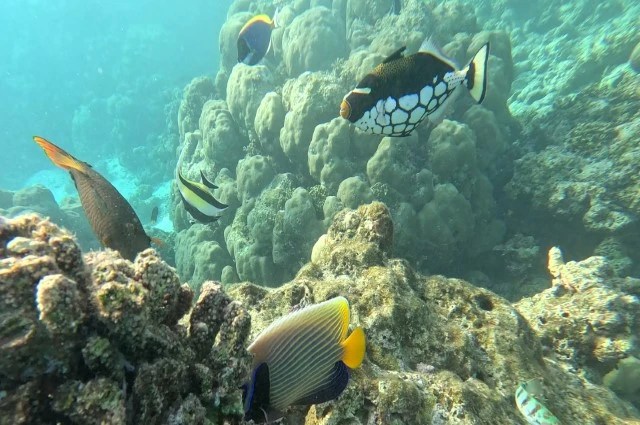 Despite the challenges reefs across the Maldives have faced from warming ocean temperatures, this reef appears to have fared better than many. Large table corals still thrive in certain areas, particularly around the water villa structures that extend away from the island.