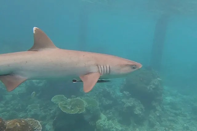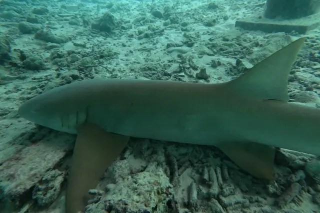 On the opposite side of the island, near the service jetty, the reef sits even closer to the beach. Here the drop-off is gentler, with healthy coral patches and regular sightings of small reef sharks cruising the shallows.