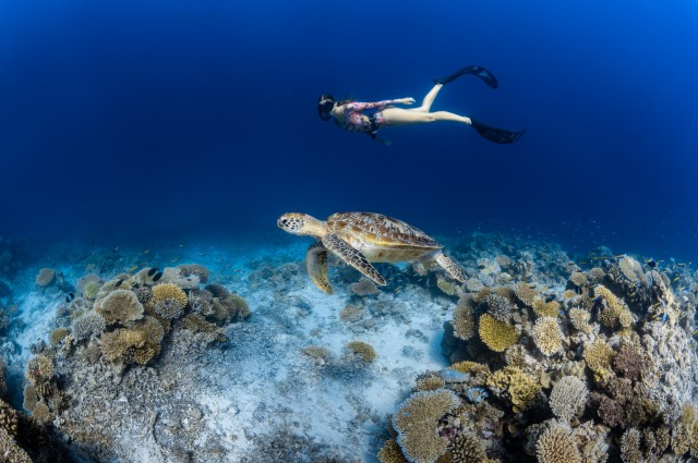 Huge schools of colourful reef fish gather along the drop-off, creating spectacular underwater scenes. One of the real pleasures of snorkelling here is the sense of solitude. With just 15 villas on the island, you’ll often have the reef almost entirely to yourself.